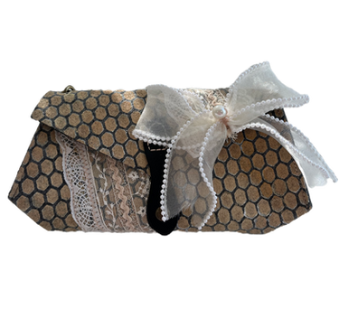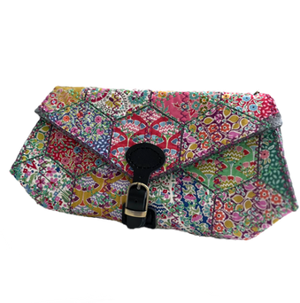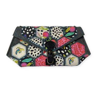 This clutch is so easy to put together, all you need to do after embellishing and stitching in place the leather tab closure is 4 simple seams. Can be hand or machine stitched.